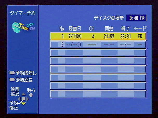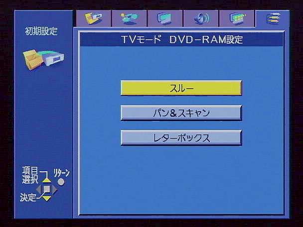 | ●システム設定 1.トップウインドウ ![]() 1−1.「ディスク管理」 ・・・ ディスクのフォーマットや、ディスク全体のプロテクト・タイトル入力 などを行う。 1−1−1.ディスクタイトルの入力画面 ・・・ 残念なことに漢字の入力は出来ない。 ![]() 1−1−2.ディスク全体のプロテクトを設定する。 ![]() 1−1−3.ディスクのフォーマットを行う。 ![]() 1−2.「プログラムナビ」 ・・・ 番組を選択して見たり、消去を行う。 ![]() 1−2−1.編集メニュー ・・・ プログラム単位の編集を行う。 ![]() 1−2−2.内容確認 ・・・ 番組のタイムスタンプのようなもの ![]() 1−2−3.部分消去 ・・・ 番組の1部分を消す処理を行う。 ![]() 1−3.「プレイリスト新規作成」 ・・・・ 番組の中のシーンを指定して、独自の順番で再生する リストを作成。 ![]() 1−4.「タイマー予約」 ・・・ タイマー予約の設定・消去を行う。 ![]() 1−4−1.タイマー設定画面 ![]() 1−4−2.タイマー設定結果 ![]() 1−5.「続き再生」 ・・・ STOPした続きから再生する。 ![]() 1−6.「プレイリスト」 ・・・ 作成したプレイリストの管理を行う。 ![]() 1−7.「初期設定」 ・・・ レコーダー全体の設定を管理する。 ![]() 1−7−1.自動電源切り時間の設定 ・・・ 電源を入れて何時間で自動で切るかの設定 ![]() 1−7−2.リモコンモードの設定 ・・・ パナ用リモコンモード ![]() 1−7−3.ワイドモードの設定 ・・・ S端子出力で繋ぐTVに合わせるための設定 ワイドTVの場合、ワイドスクリーンに切り替える信号が出力され 自動で画面が切り替わるようになる。 ![]() 1−7−4.時刻合わせ ![]() 1−7−5.チャンネルのマニュアル設定 ![]() 1−7−6.BSチューナー連動用設定 ![]() 1−7−7.設定の初期化 ・・・ 設定した内容をすべて出荷時の内容に戻す ![]() 1−7−8.DVDビデオ再生時の初期設定 ![]() 1−7−9.視聴制限の設定 ・・・ 小さいほど規制が掛かる ![]() 1−7−10.再生映像の設定 ![]() 1−7−11.再生音声の設定 ![]() 1−7−12.画面表示の設定 ![]() 1−7−13.FLディスプレイの明るさ設定 ![]() 1−7−14.接続TVの設定 ・・・ 従来の4:3TVか、ワイドTVか ![]() 1−7−15.DVDソフトがレターボックス収録時の再生モードを設定 ![]() 1−7−16.DVD−RAMディスク再生時の画面モードを設定 ![]() 1−7−17.外部入力3の設定 ・・・ 単なるLINE3とするか、BSチューナー連動とするか ![]() |